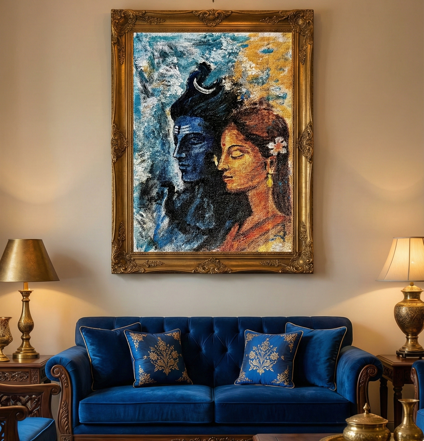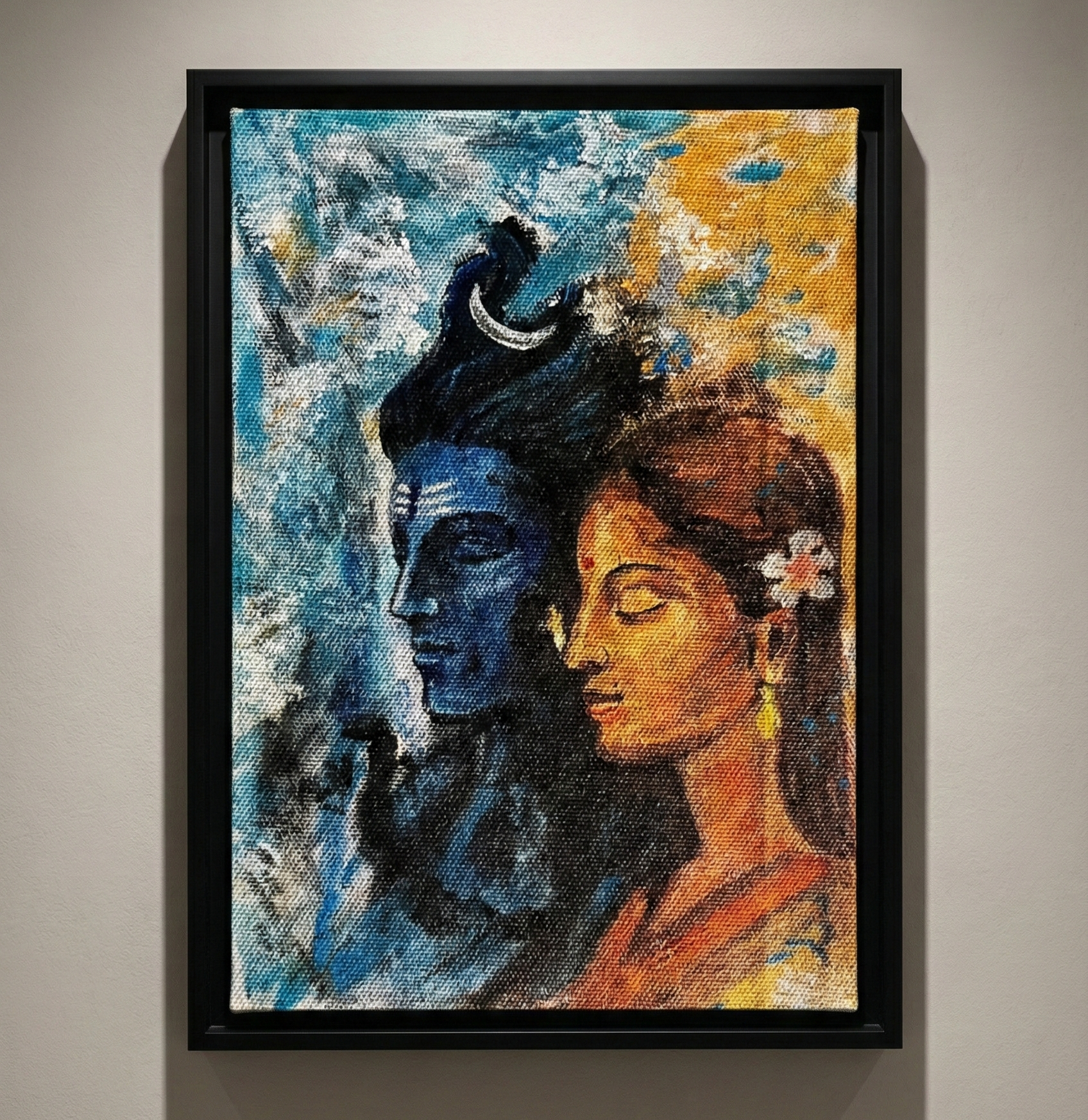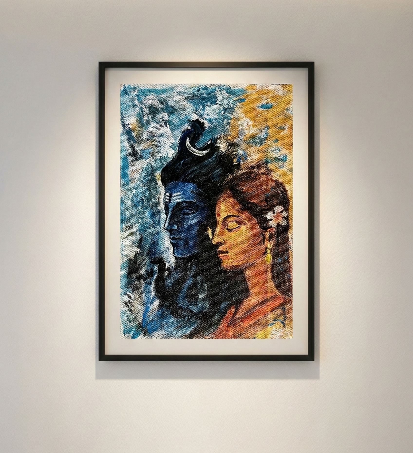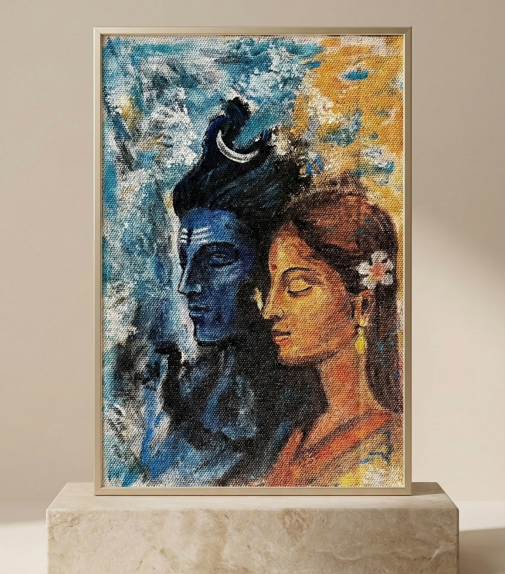 This painting captures the divine union of Lord Shiva and Goddess Shakti, symbolizing the eternal balance between consciousness and energy. Rendered in expressive strokes and textured layers, the artwork blends deep blues and warm earthy tones to reflect stillness and movement, strength and grace.