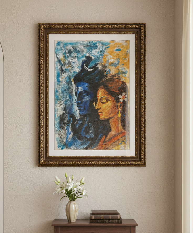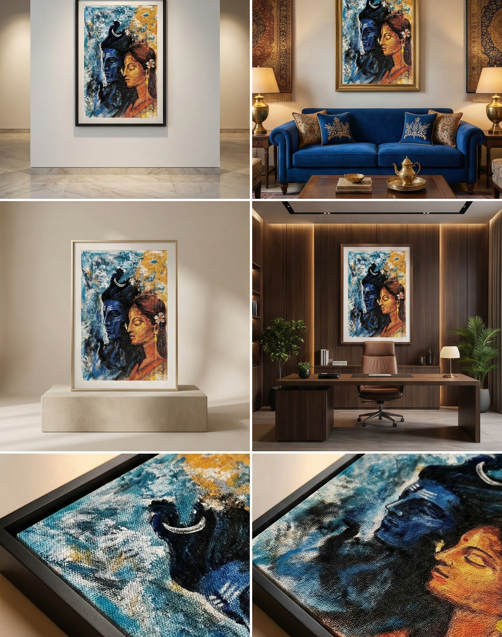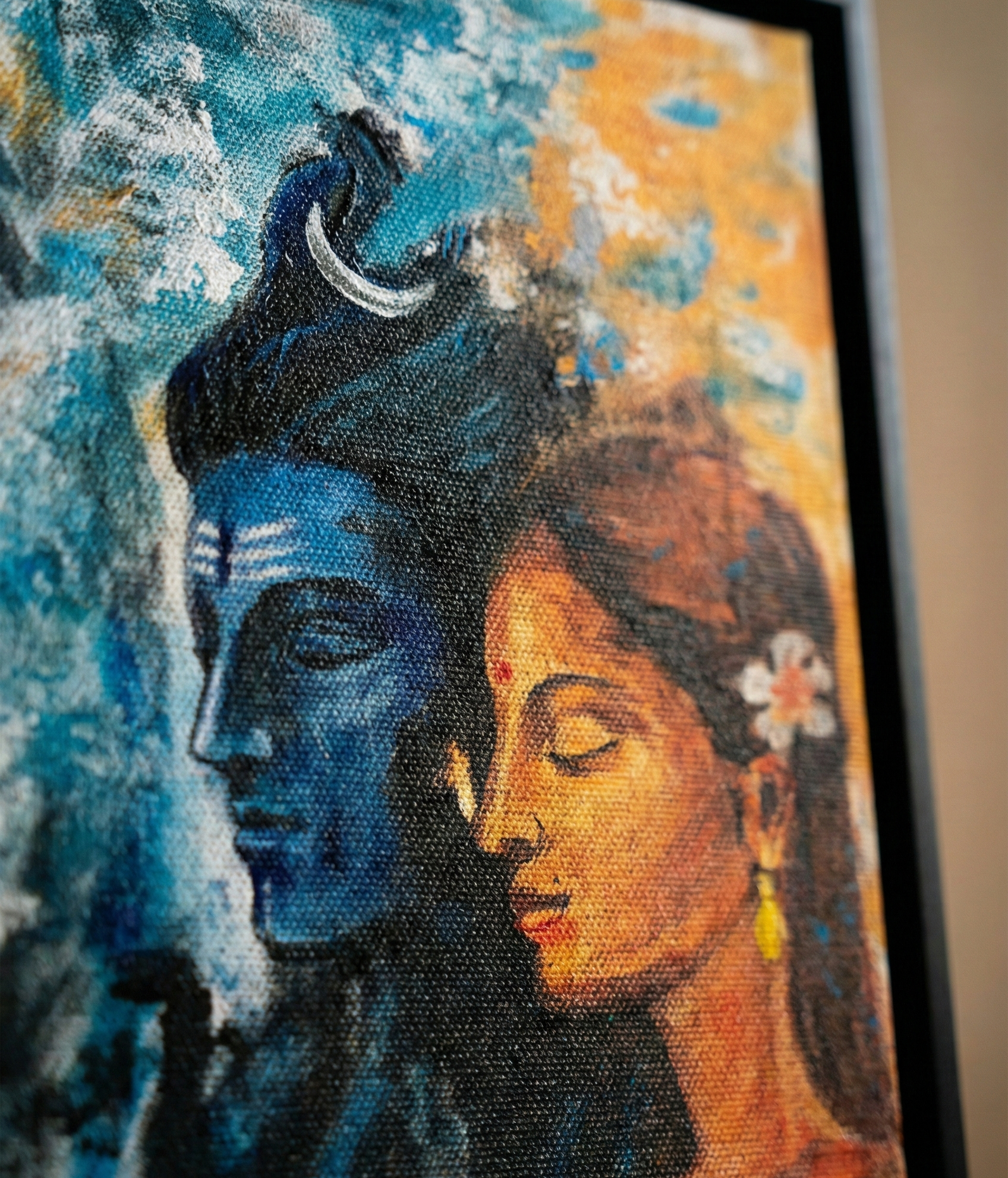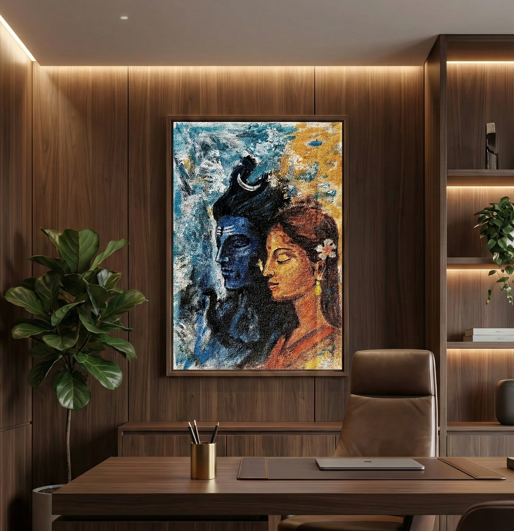 This painting captures the divine union of Lord Shiva and Goddess Shakti, symbolizing the eternal balance between consciousness and energy. Rendered in expressive strokes and textured layers, the artwork blends deep blues and warm earthy tones to reflect stillness and movement, strength and grace.